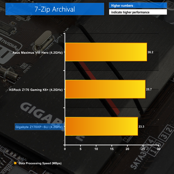 7-Zip is very sensitive to bandwidth and general performance of the memory subsystem, so it is no surprise to see reduced performance for Gigabyte's offering. As previously mentioned, this reduced memory-related performance seems to be an early BIOS bug and I would not be surprised to see an update fix the issue.