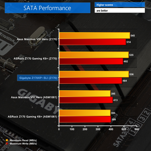 Accounting for degradation in the operating state of our test SSD, SATA 6Gbps performance for Gigabyte's Z170XP-SLI is roughly where would expect it to be for ports fed by the Z170 chipset.