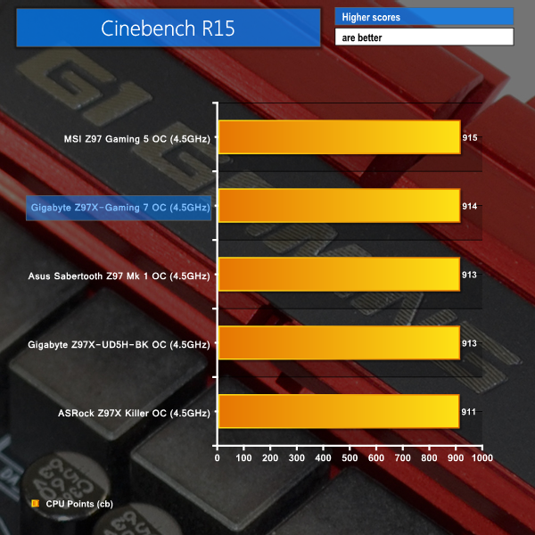 As a performance comparison, we have included the overclocked results from four other Z97 motherboards. The maximum overclocked configuration achieved with each board was a 4500MHz (45 x 100MHz) processor frequency and 2400MHz CL10 memory speed.