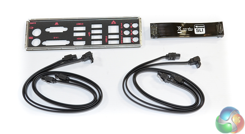 Gigabyte opts for a basic ‘no-frills' bundle that comprises four SATA cables, the rear IO shield, and a black SLI bridge. We don't have any complaints with the bundle; there are no glaringly obvious exclusions.