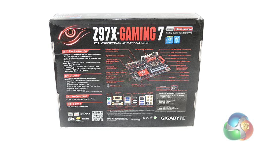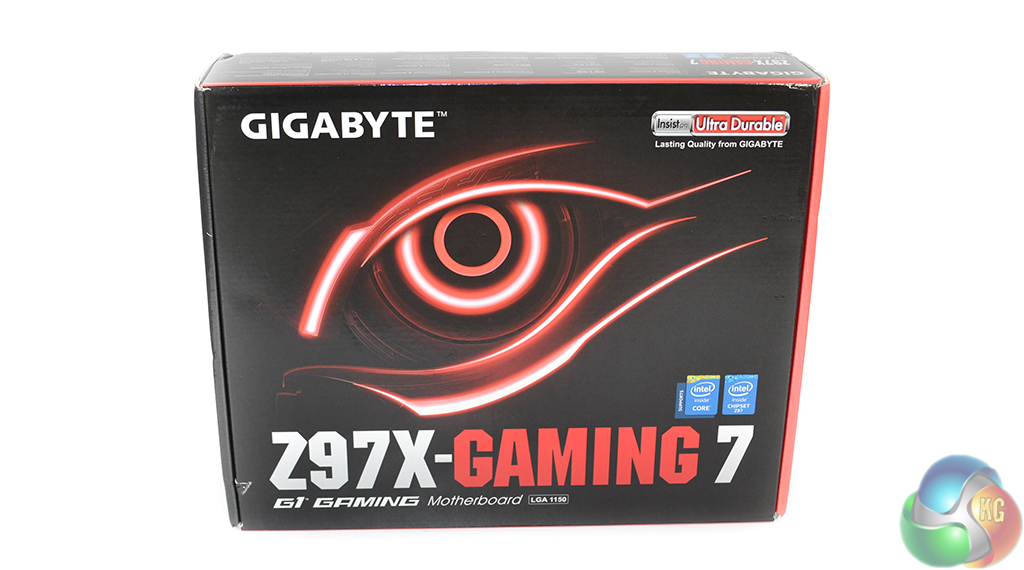 Gigabyte supplies the Z97X-Gaming 7 in red and black packaging, representing the newly adopted colour scheme for the company's G1 Gaming series motherboards.