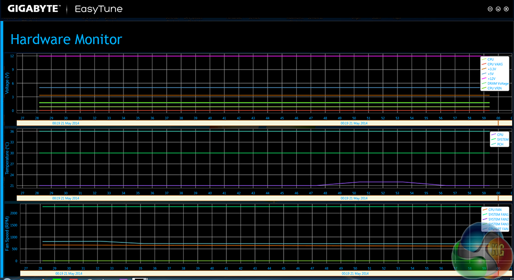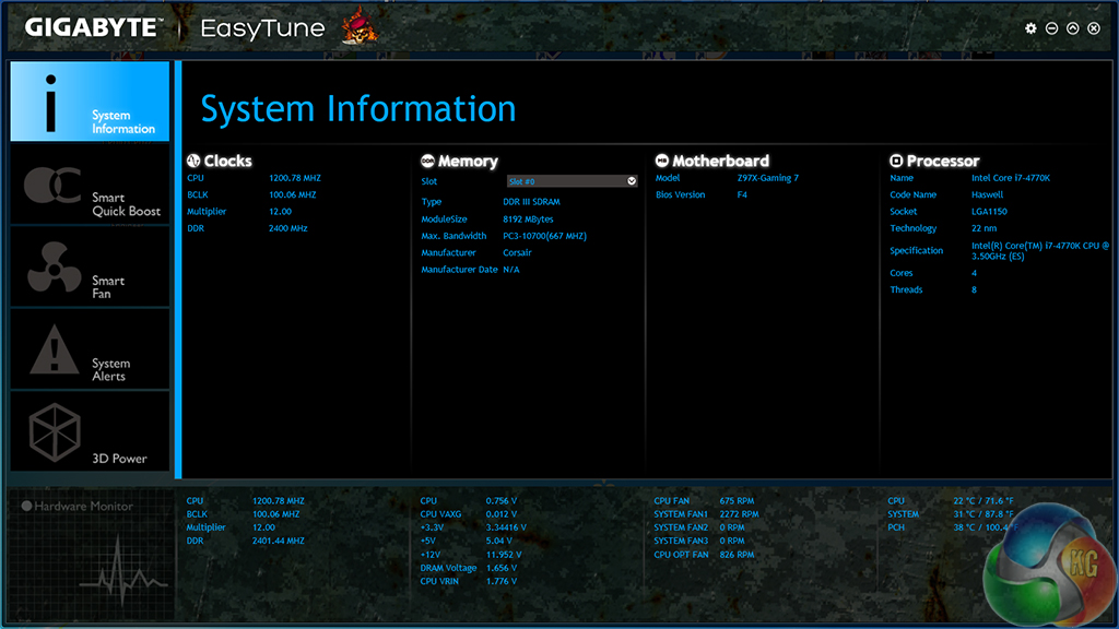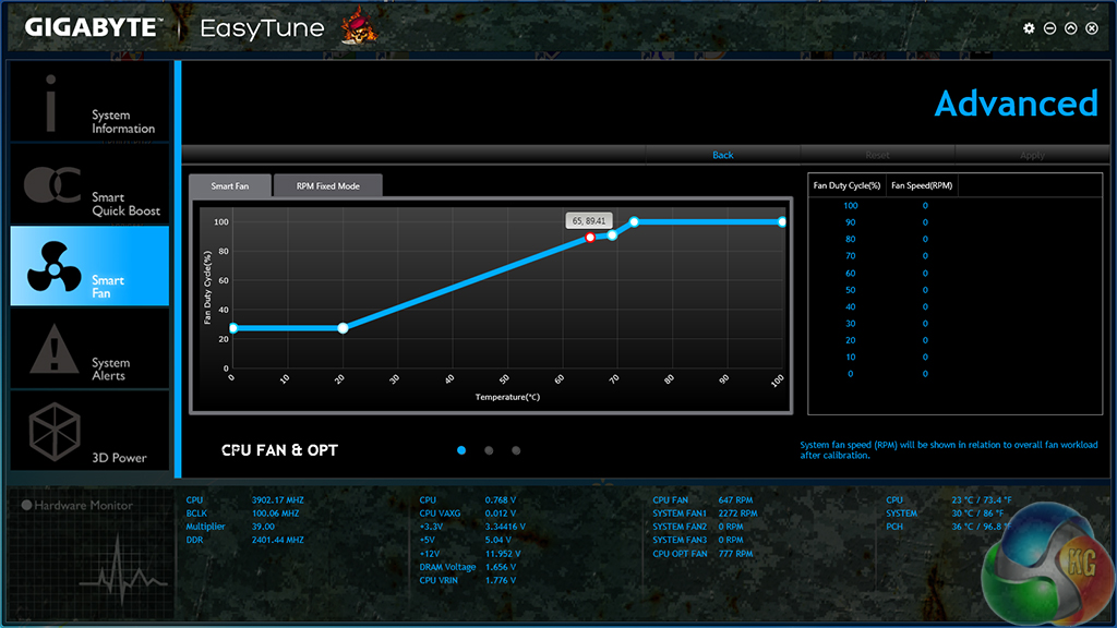 System information is continuously displayed at the bottom of the EasyTune window. Making up for the lacklustre UEFI approach, settings for a custom fan speed profile can be tweaked via their own section in Gigabyte's software suite.