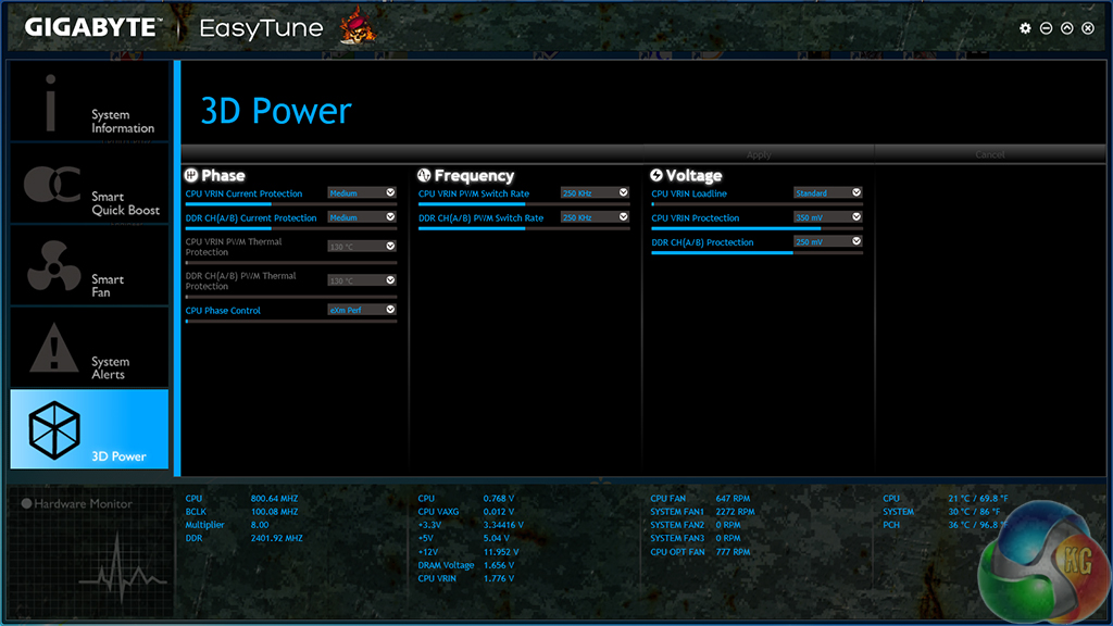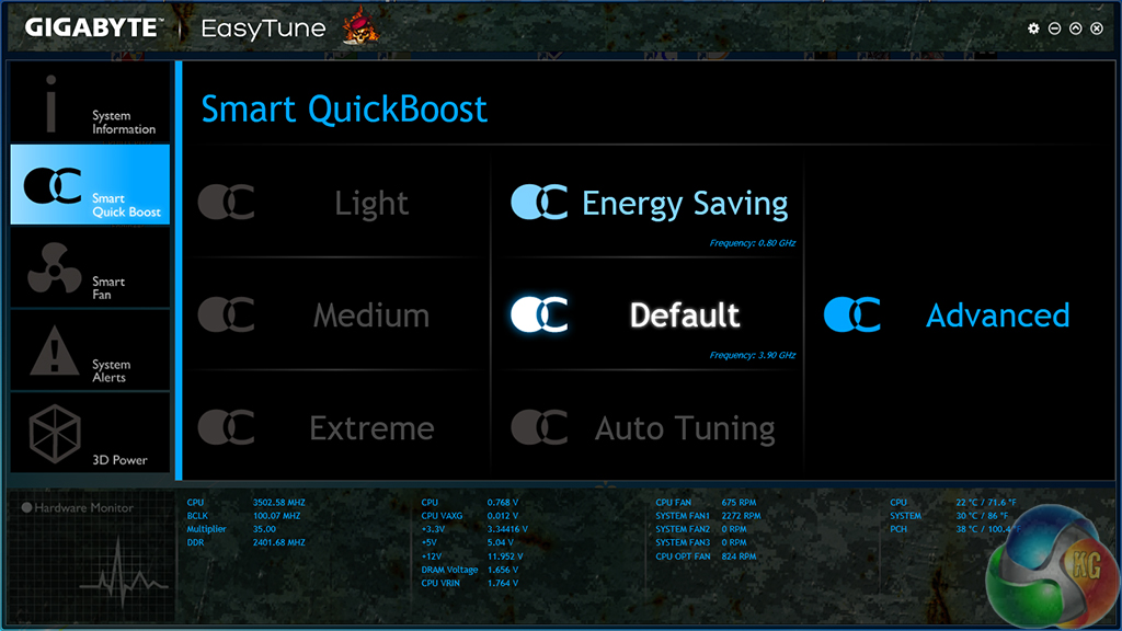 Gigabyte's EasyTune software allows users to view and adjust frequency, voltage, and other overclocking-related settings in an OS environment. Pre-set frequency profiles can also be selected, as can an auto tuning overclocking tool.