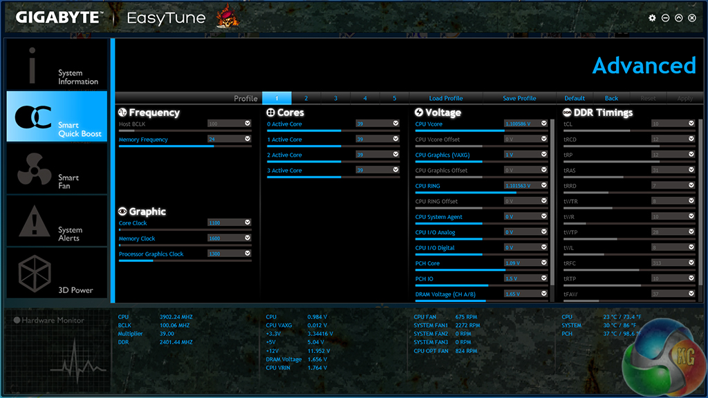 Being a G1 Gaming series motherboard, Gigabyte makes the part compatible with an extra version of the EasyTune software (the one we got when downloading software via Gigabyte's webpage). It's not just the skin that is different, though; compared to the standard EasyTune software, the G1 Gaming part seems to be allocated additional settings.