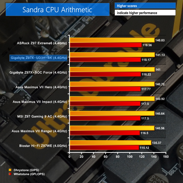 Gigabyte's Z97X-UD3H-BK shows positive performance in our batch of system-related benchmarks. The 3DMark Physics score is positive, and Sandra's Processor Arithmetic result puts the board in the top pair of contenders.