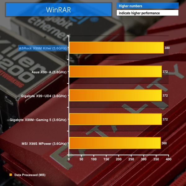 WinRAR’s built in benchmark and hardware test can help us outline the performance differentials between each motherboard. We record the amount of data processed after a 30-second run.