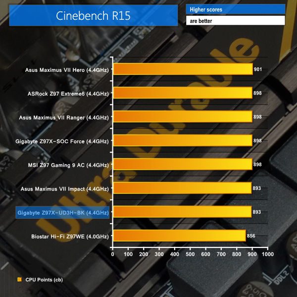 The CPU-related performance numbers posted in WinRAR and Cinebench are slightly disappointing for the Z97X-UD3H-BK. Cinebench places the Gigabyte part 8 points (~1%) down on the leading motherboard.