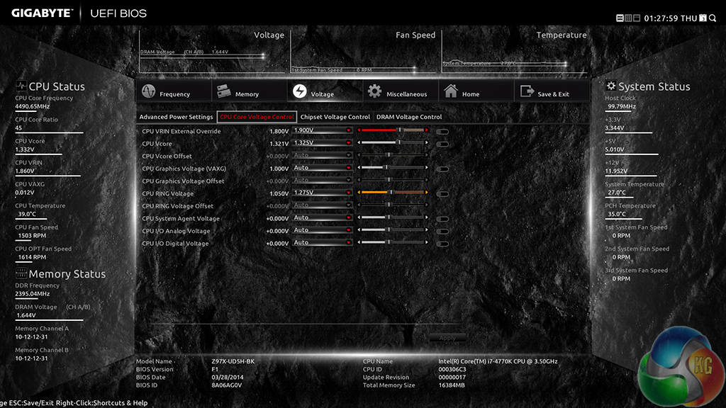 To test the Gigabyte Z97X-UD5H-BK Black Edition motherboard’s CPU overclocking potential, we first increased the CPU VCore to 1.325V, Cache voltage (called RING voltage) to 1.275V, and CPU Input Voltage (called VRIN) to 1.900V. LLC was set to ‘Auto’.