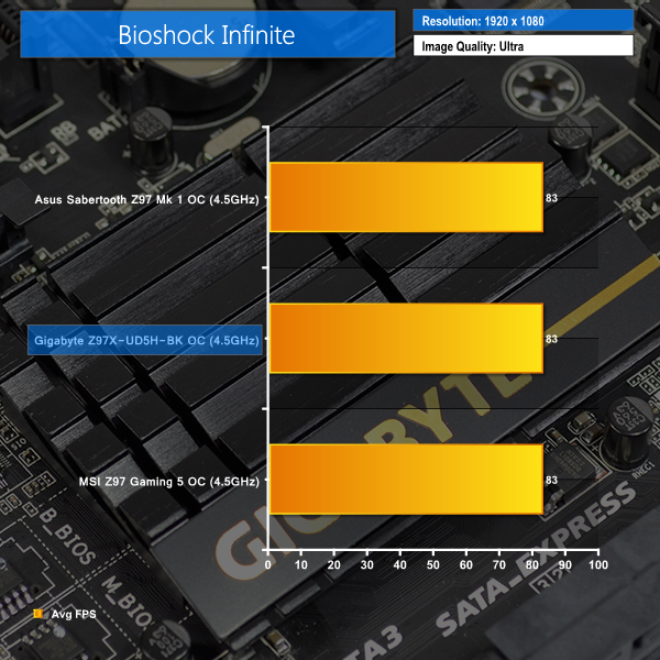 Overclocked performance is as expected; Gigabyte's Z97X-UD5H-BK is happy to trade blows with competing motherboards. There are no score differentials which highlight any cause for concern.