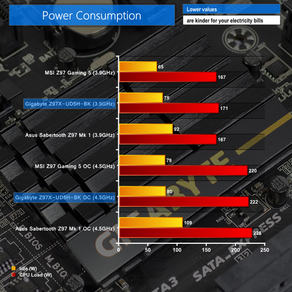 Operating under Intel's low power states at idle, Gigabyte's Z97X-UD5H-BK delivers solid power consumption numbers for a controller-heavy motherboard. Overclocked figures help to speak for the efficiency of Gigabyte's “durable” power delivery system.