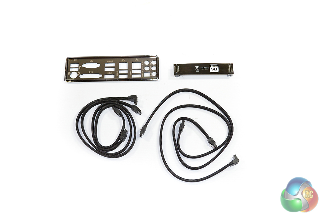 Despite the Z97X-UD5H-BK motherboard's upper-mid range price point, Gigabyte includes a bare accessory bundle. A black IO shield is accompanied by a dark black SLI bridge and four SATA cables.