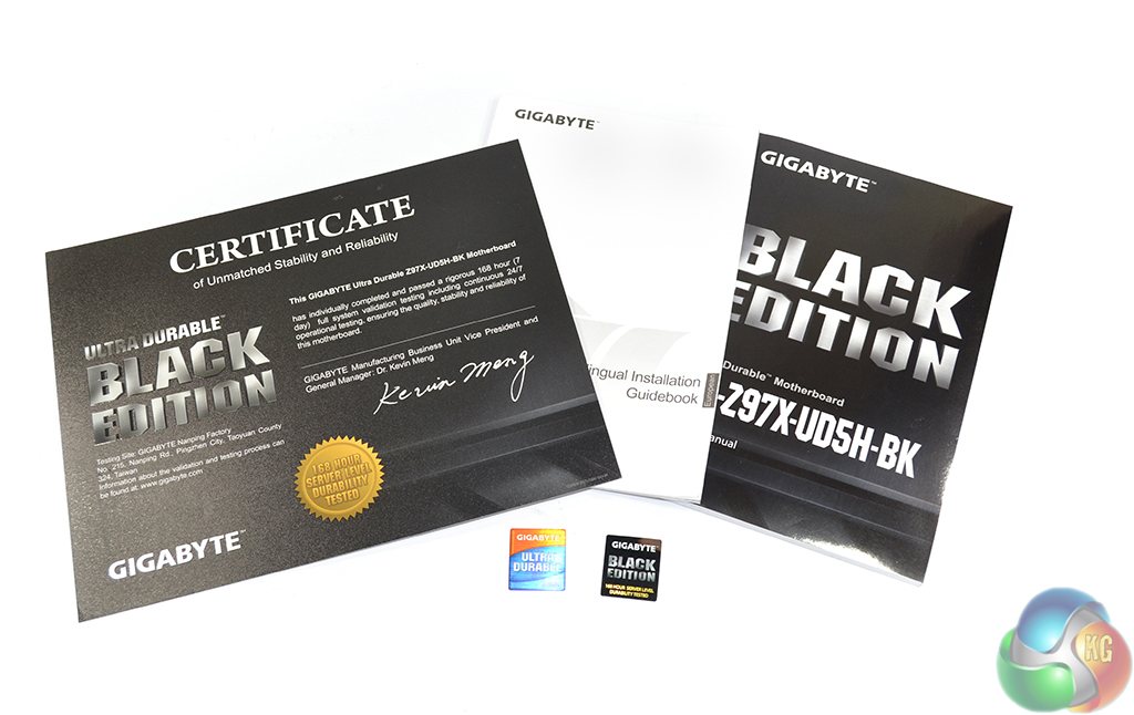 Documentation is supplied in the form of manuals, a drivers disk, two case badges, and a certificate. Gigabyte's included certificate of reliability and stability states that the Z97X-UD5H-BK motherboard has passed a week-long continuous operation test.
