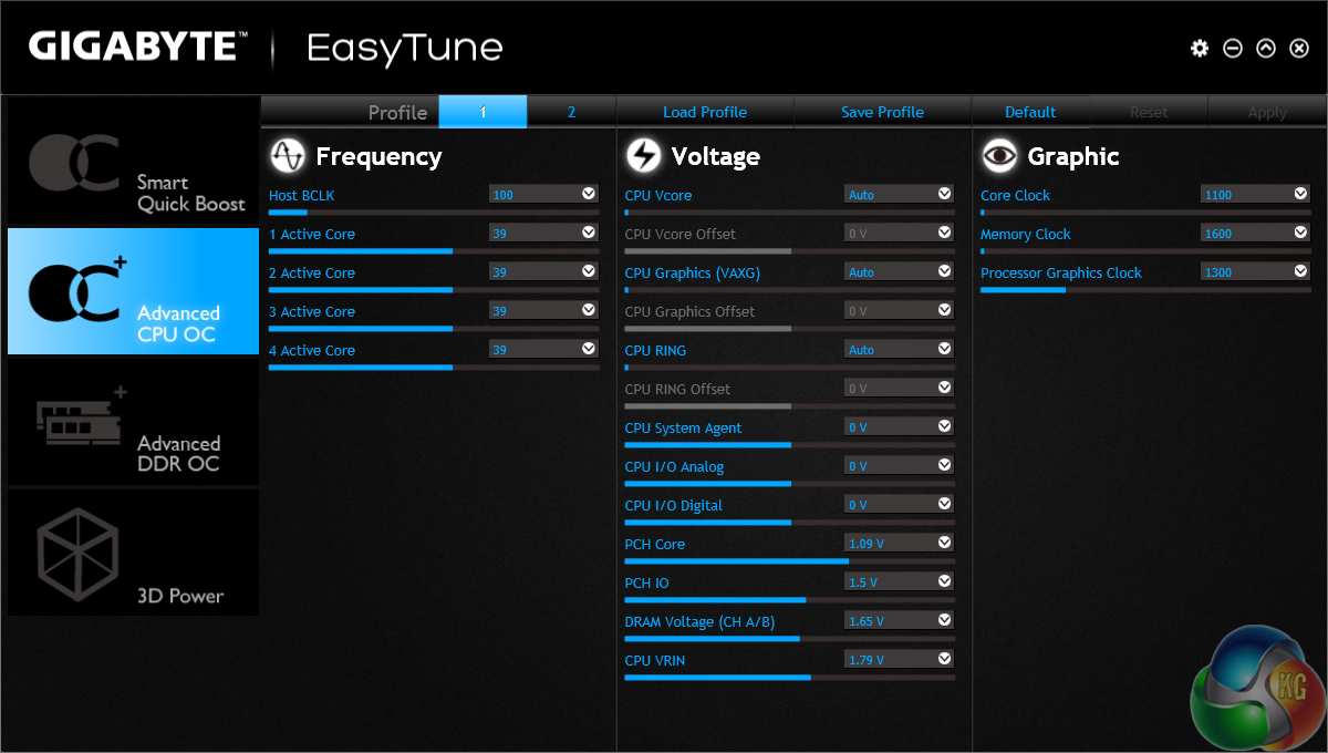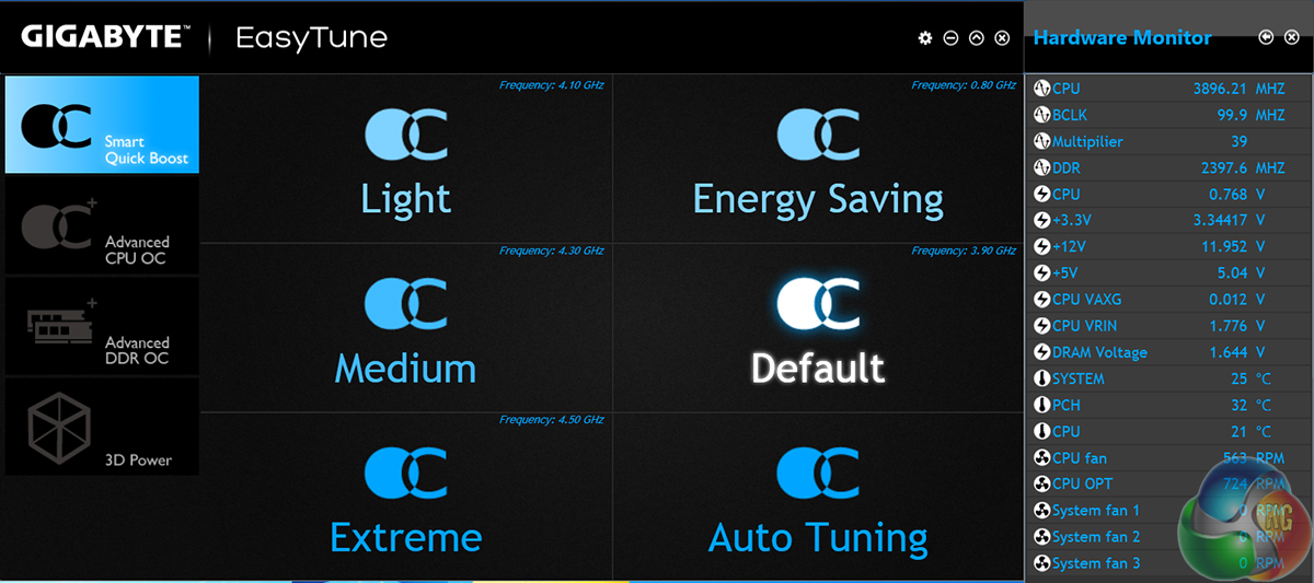 Gigabyte's EasyTune software allows users to view and adjust frequency, voltage, and other overclocking-related settings in an OS environment. Pre-set frequency profiles can also be selected.
