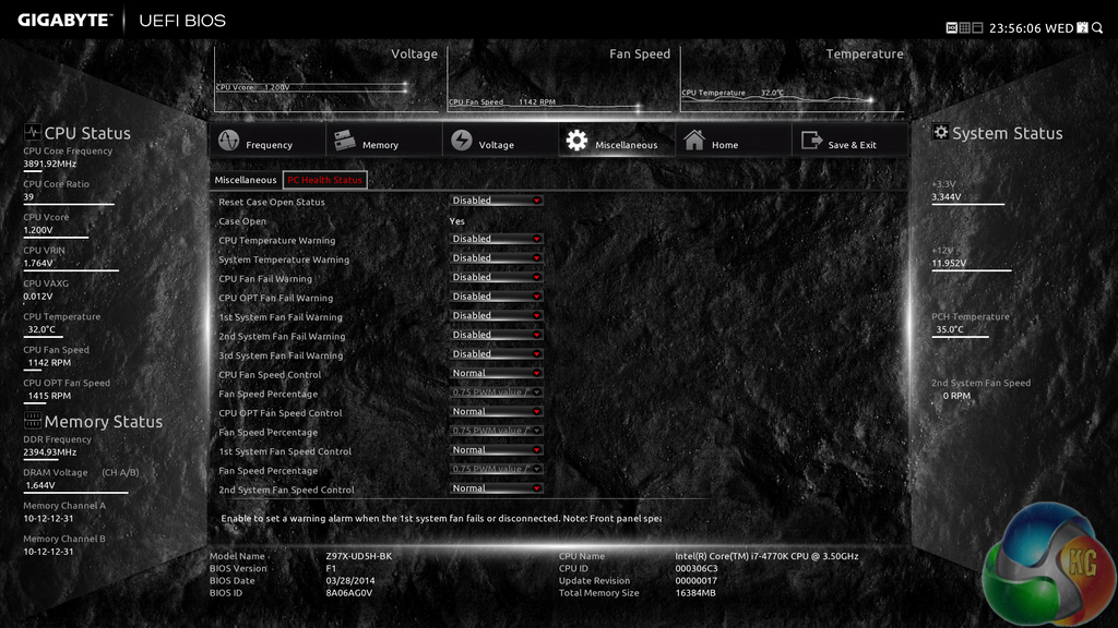 Fan and warning settings can be accessed via the PC Health Status column of the Miscellaneous section. Fan speed controls can be set to a user's preference, albeit with a limited range of input.