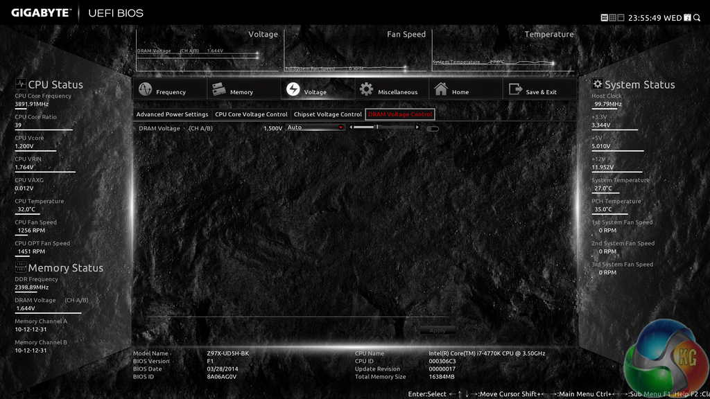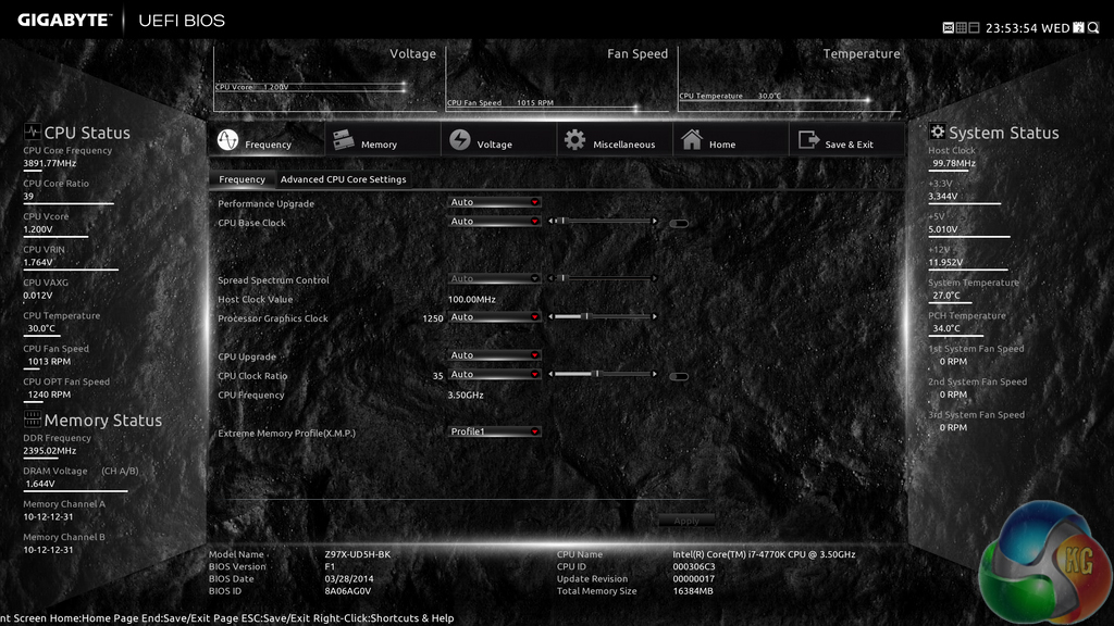 Upon entering the 1920 x 1080 (dependent upon your monitor's resolution) UEFI, Gigabyte opens the frequency page. The interface packs large amounts of information into a single screen by virtue of its 1920 x 1080 resolution. Voltages, frequencies and other monitoring parameters are consistently scattered around the outside of each page.