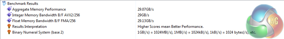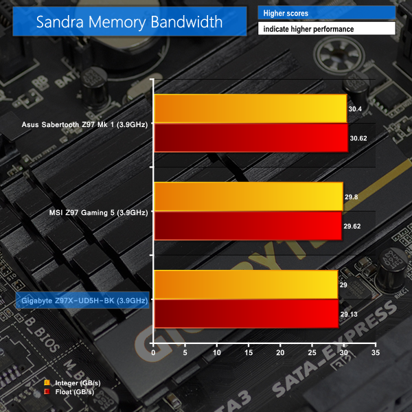 MSI's Z97-based motherboard outscores Gigabyte's by between one-and-a-half and two-and-a-half percent in the memory bandwidth test. This small differential is like to be related to variables and errors in the test software and its procedure.