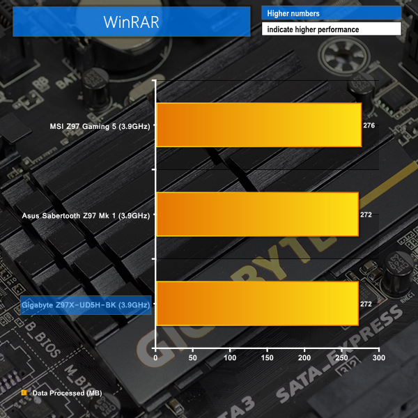WinRAR’s built in benchmark and hardware test can help us outline the performance differentials between each motherboard. We record the amount of data processed after a 30-second run.