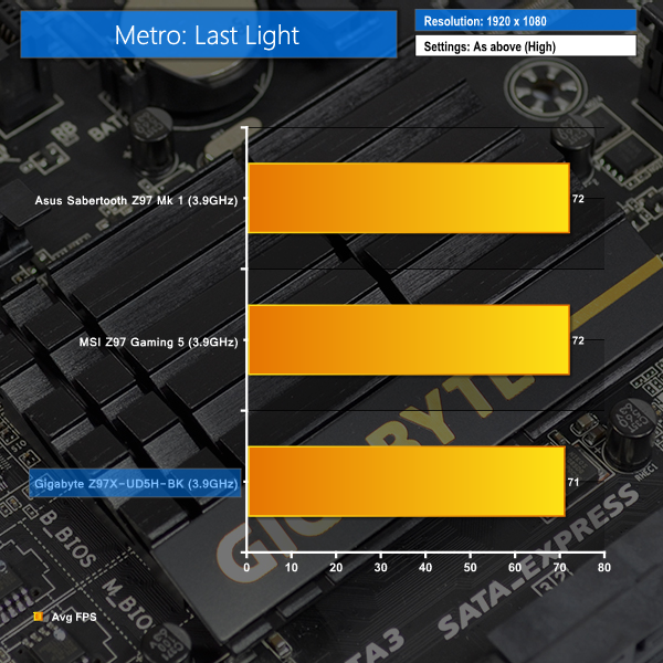 In comparison to the other Z97 motherboards, a single frame (1.4%) is dropped by the Z97X-UD5H-BK in the Metro: Last Light benchmark.