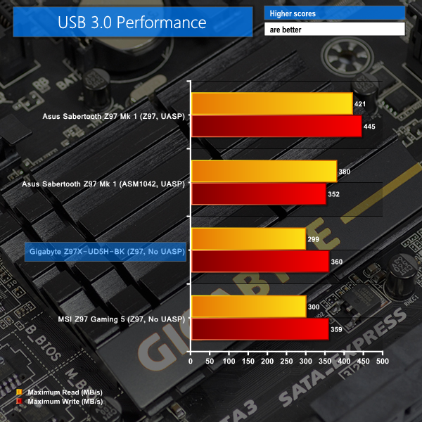 Gigabyte does not provide a UASP-activating software tool (as Asus and ASRock do) for Windows 7 users, hence the Z97X-UD5H-BK's USB 3.0 transfer rates are limited to 360MBps and lower, rather than the interface's typical limit of around 450MBps.