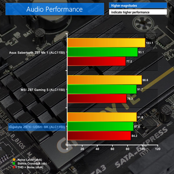 RMAA reports the Gigabyte Z97X-UD5H-BK motherboard as having an audio solution with Excellent performance. The numerical results are in the region that we would expect them to be for a Realtek ALC1150-based solution. Total Harmonic Distortion + Noise performance of the Z97X-UD5H-BK is strong.