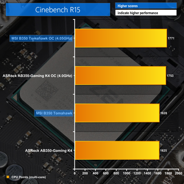 As a performance comparison, we have included the results from ASRock's Fatal1ty AB350-Gaming K4 motherboard. The maximum overclocked configuration achieved with the ASRock board was a 4000MHz (40.0 x 100MHz) processor frequency whilst using 3200MHz CL14 memory.