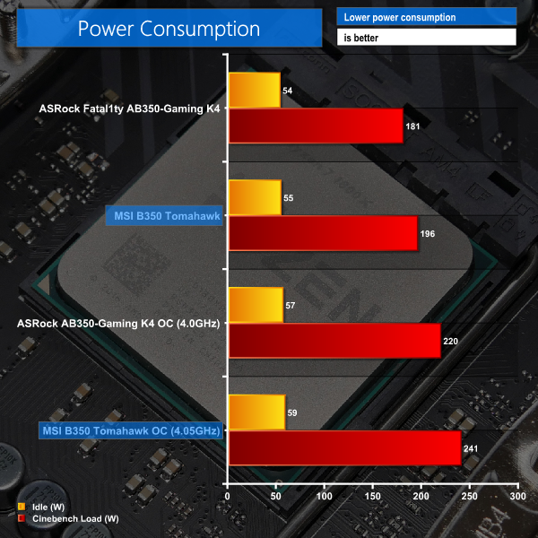 Power draw from the MSI B350 Tomahawk is on the high side due to aggressive voltage tuning. Stock-clocked load voltage is quite high at around 1.3V with an 1800X. The improved accuracy compared to ASRock's offering allowed MSI's board to extract more performance from our 1800X which in turn required greater power draw.