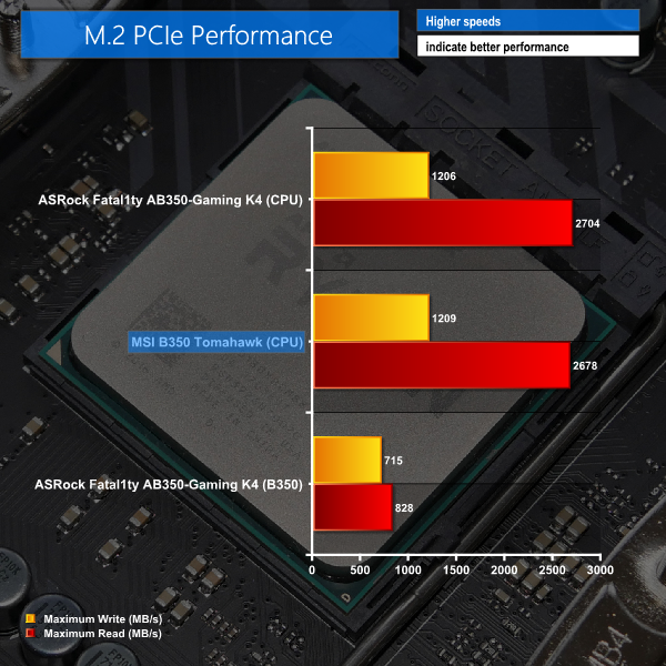 No problems with the PCIe M.2 performance from the single port on MSI's B350 Tomahawk. This slot is fed directly by an AM4 CPU and MSI chooses not to add a second M.2 slot that is driven by chipset-based lanes.