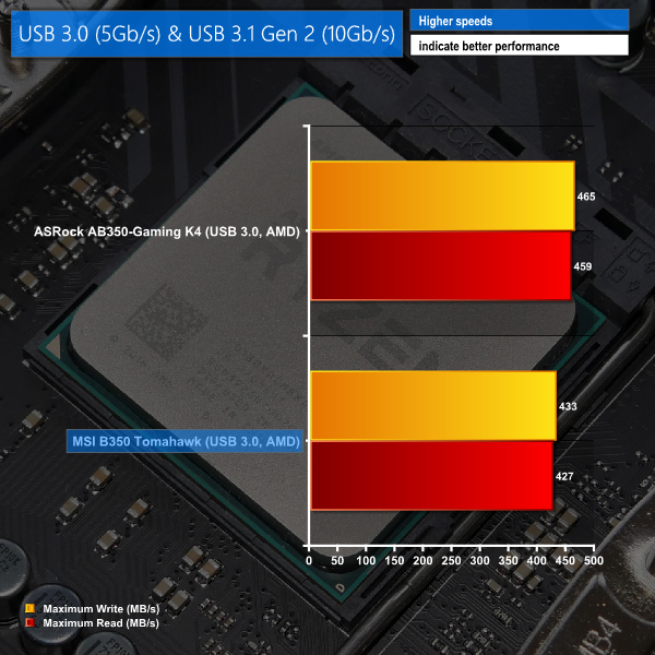 MSI trails ASRock in the USB 3.0 5Gbps transfer rate department. There is no USB 3.1 Gen 2 10Gbps connectivity on the B350 Tomahawk, meaning that transfer rates of around 430MBps are as fast as it gets for external connectivity.