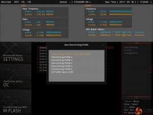 Up to six individual settings profiles can be saved to the board and more can be transferred using storage mediums. Pressing F8 and F9 on a main page of the UEFI draws down an overclocking profile tool which allows for saving and loading.
