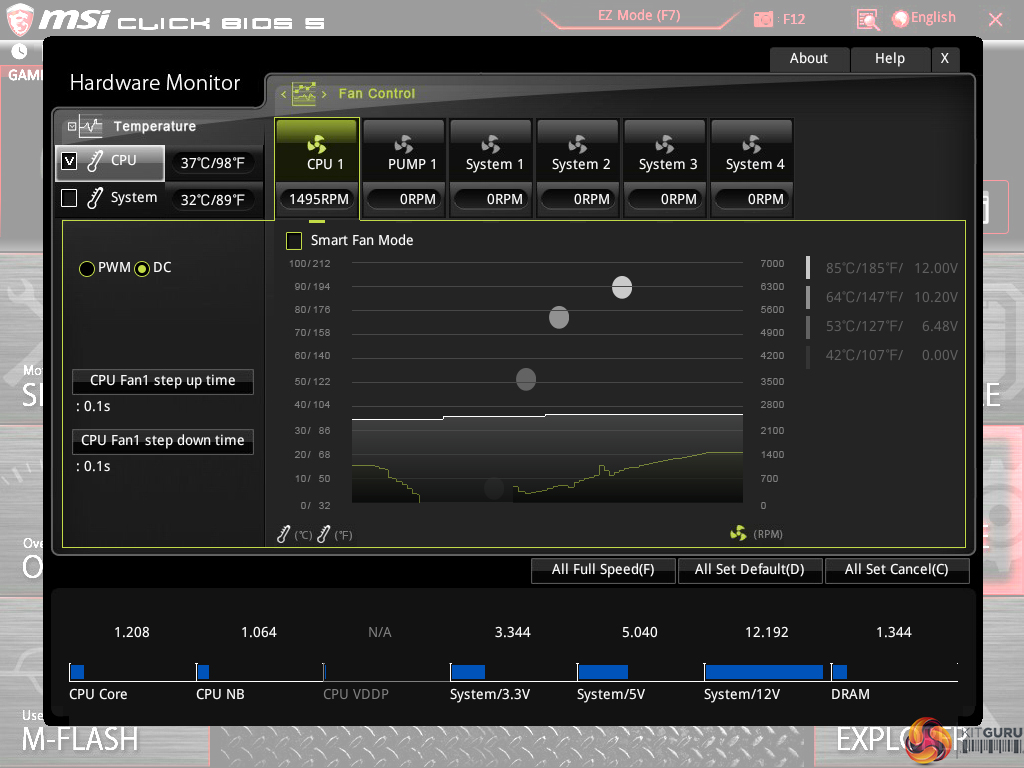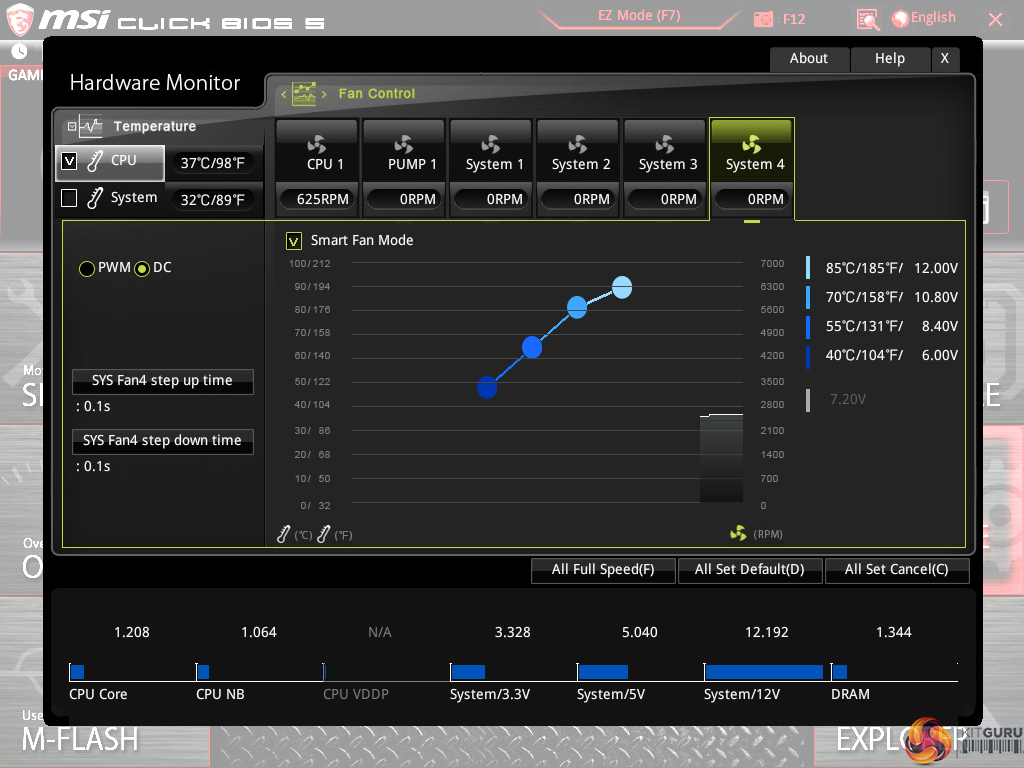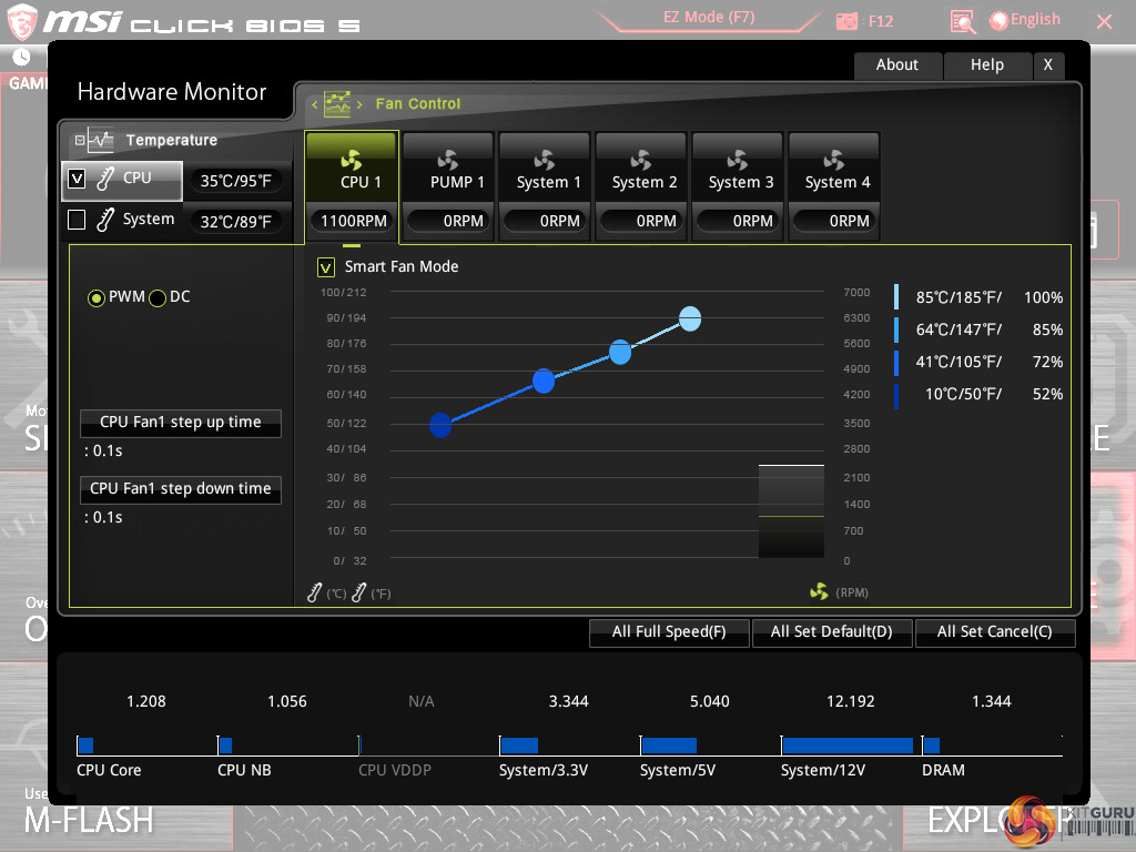 Hardware Monitor is where the primary fan control actions take place. PWM and DC control modes are selectable. MSI keeps in-built fan speed presets to a bare minimum and instead relies on its good graphical control method.