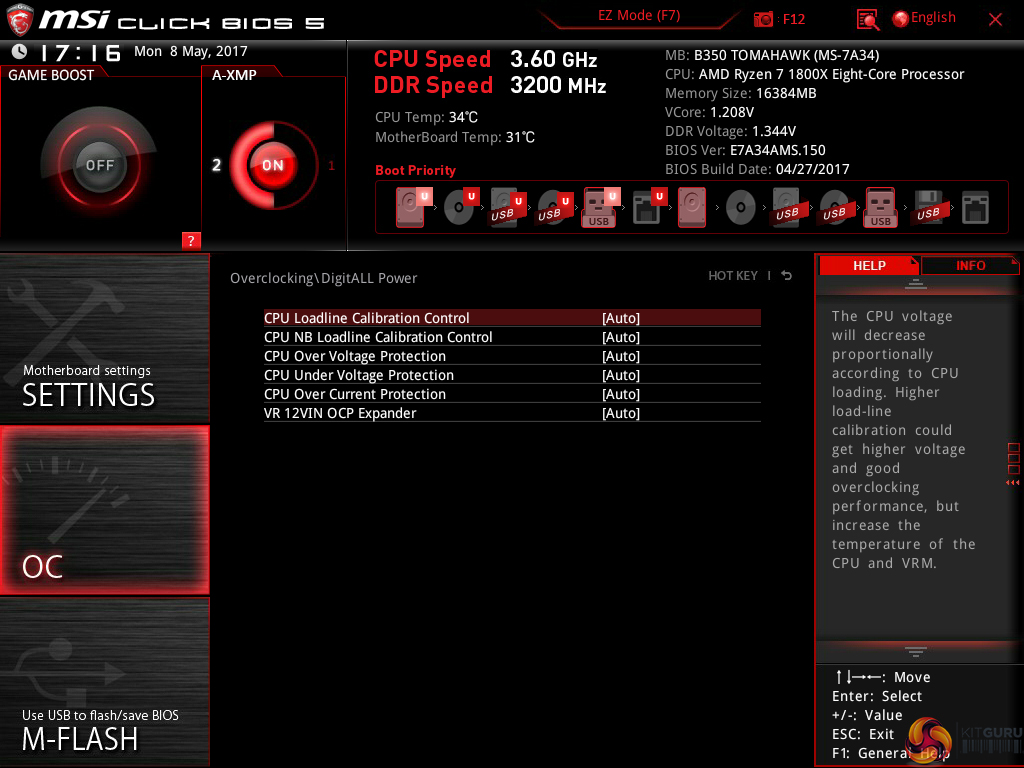 Unlike the X370 alternatives, MSI’s load-line calibration (LLC) settings for B350 are unclear. Nine different options can be selected but MSI chooses not to deploy its simple graph to show how the voltage changes based on load. The graph would have aided the simplicity of our overclocking attempts but instead we had to resort to a trial and error approach.
