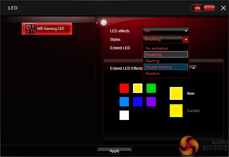 The LED section of MSI’s Gaming App is where most users are likely to be spending their time. Individual control is given to the lighting section of the motherboard and the 4-pin RGB header. There is also an option to completely switch off all LED lighting.