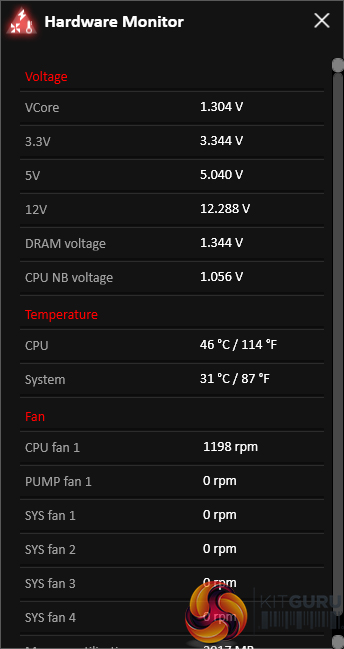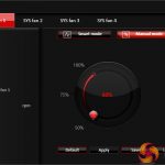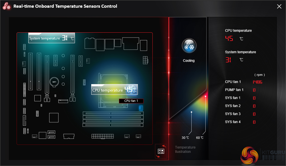 MSI’s temperature sensor page is good although the number of reading points is limited to just two – the CPU and system. This page also shows which fans are connected and a temperature illustration can be set to give visual interpretation of system behaviour.