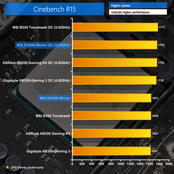 The CPU overclock on the B350M Mortar delivered a strong gain in Cinebench performance. MSI's own Tomahawk still leads this chart thanks to its better overclocking result.