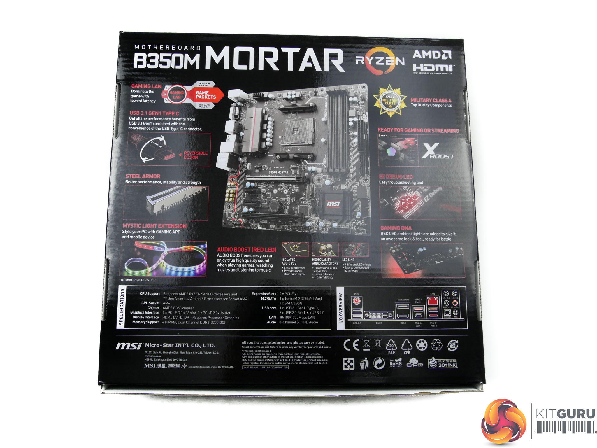 Shiny packaging houses the B350M Mortar. An annotated image and clear specifications are highlighted on the rear of the box.