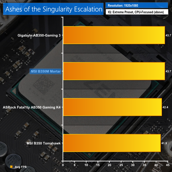 Gaming performance for the B350M Mortar is fine. A recent update to Ashes of the Singularity Escalation delivers flattering results for MSI (and Gigabyte) while Metro turns in a little slower than the competition but not by a worrying margin.