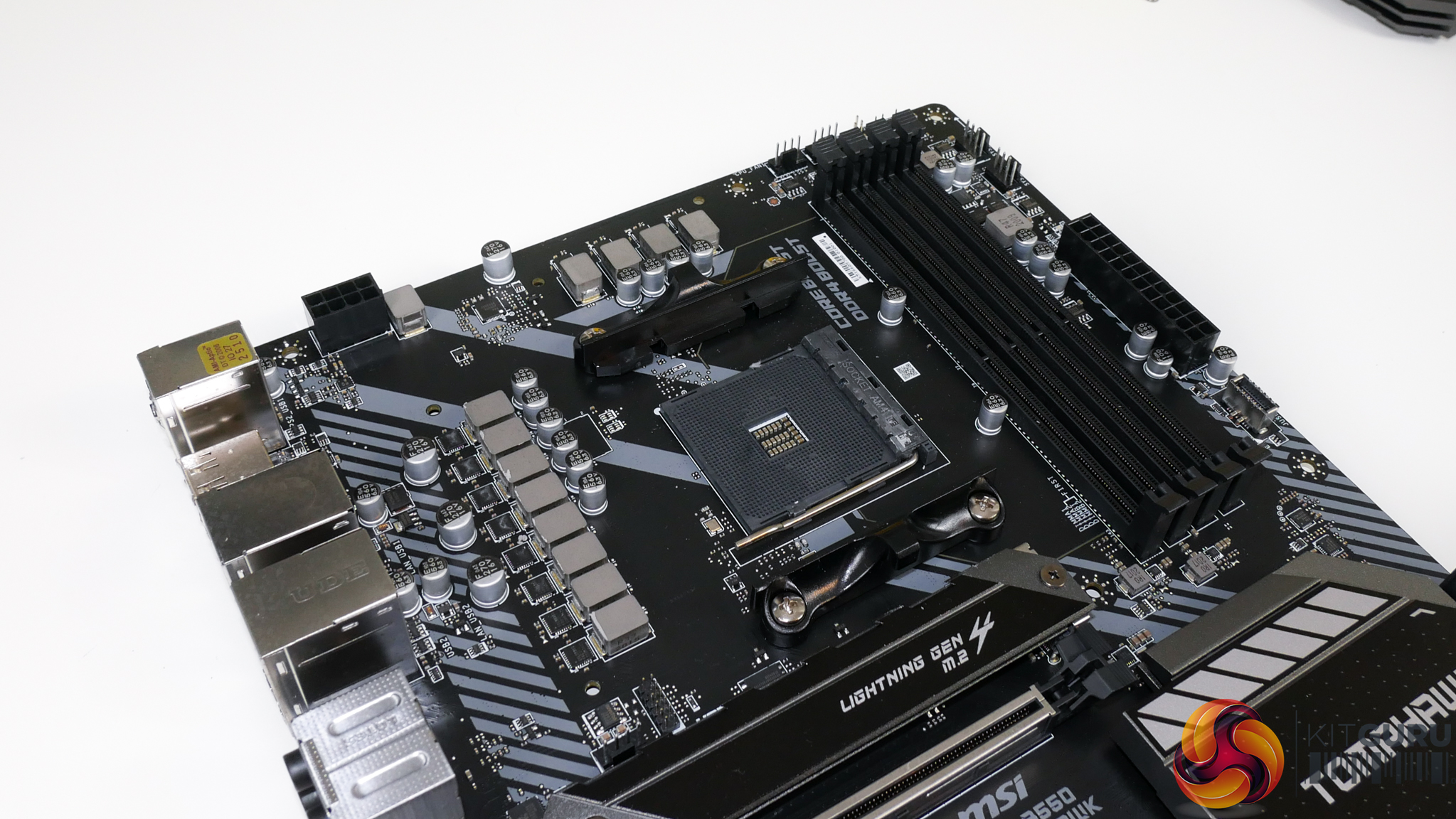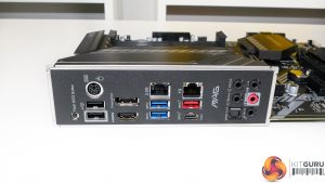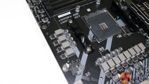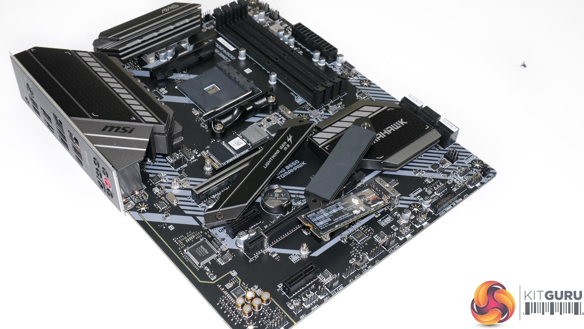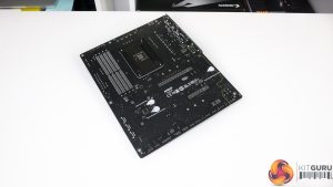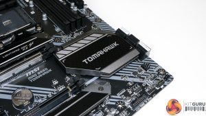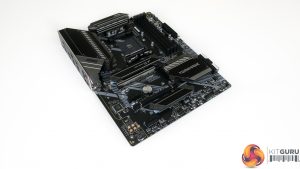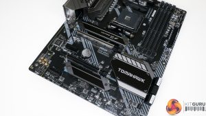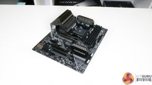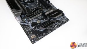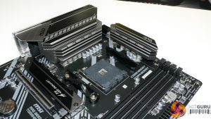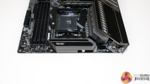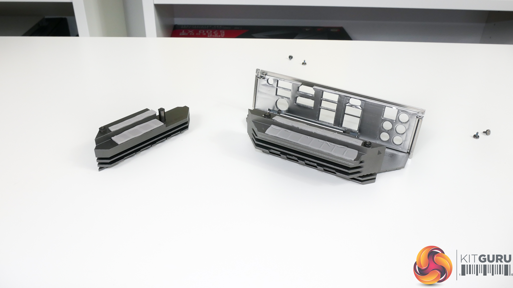 Most notable when looking at the motherboard are the sizable VRM heatsinks – one of which doubles up as the rear IO cover.