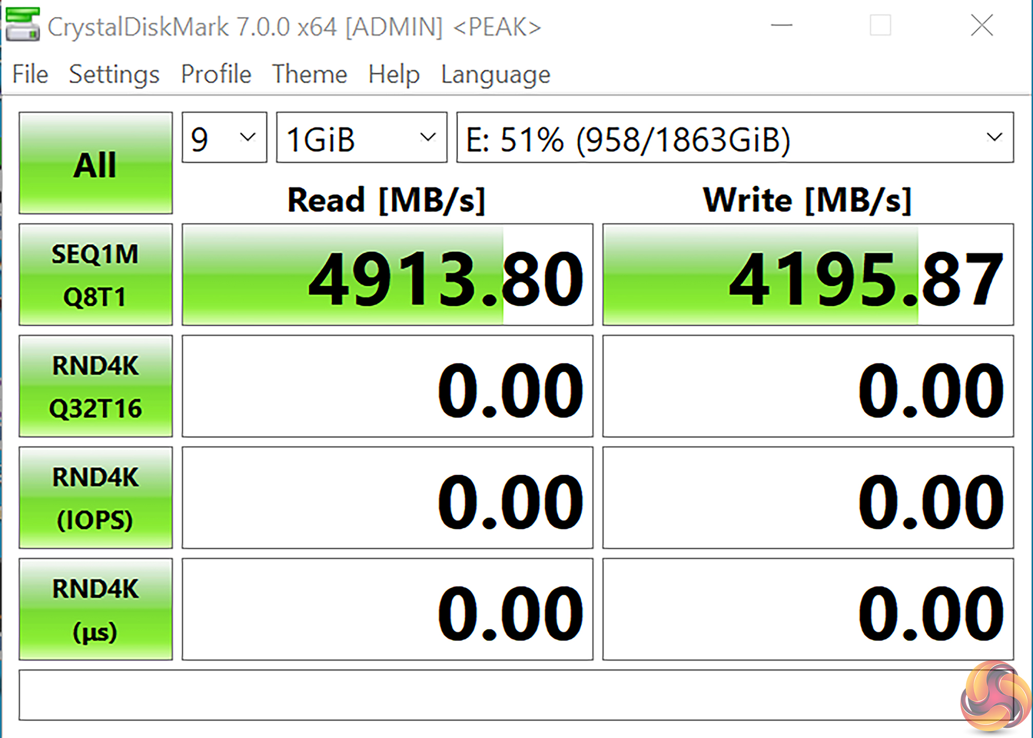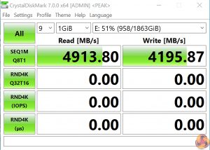 M.2 performance is at the level we expect, with the read result coming in at just below 5GBps. Of course, any M.2 SSD installed in the chipset-connected slot will be limited to PCIe Gen 3 x4 bandwidth and any CPU-to-chipset link speed restrictions.