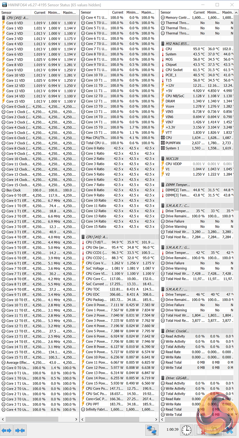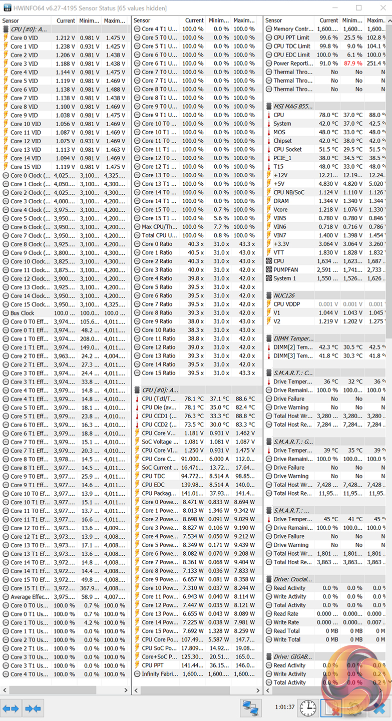 The usual 4.25GHz overclock of our Ryzen 9 3950X 16-core CPU was achieved. Typically, we opt for 1.3V but the MSI motherboard was better set with 1.275V and Mode 3 LLC. This delivered around 1.26V under heavy load – a similar level to the competing B550 offerings.