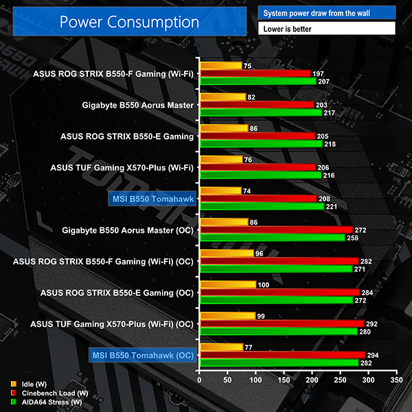 MSI’s B550 MAG Tomahawk could certainly use a small improvement to voltage tweaking at stock conditions, as indicated by the higher power consumption levels.