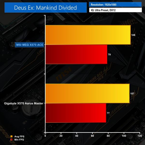 The X570 ACE also shows strong performance in Deux Ex, managing to beat out the Gigabyte X570 Aorus Master by 1 FPS on average and 2 FPS on the minimum. Shadow of the Tomb Raider registers another victory for the MSI board, this time with a 4 FPS advantage on average and 3 FPS on the minimum.