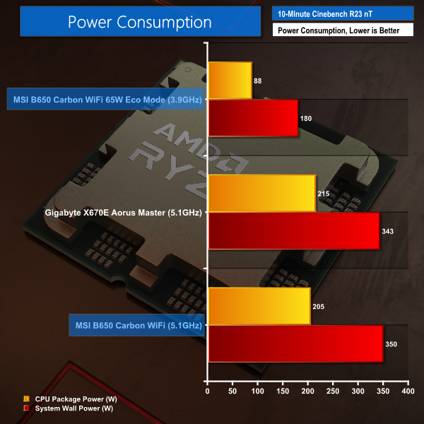Power looks to be an area where MSI’s B650 Carbon WiFi shows some slight weaknesses versus the much more expensive X670E reference board and its beefier VRM configuration.
