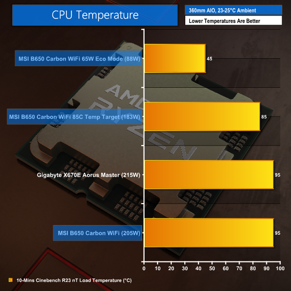 Judging by the performance numbers, the reduced temperature target running mode is highly efficient at maintaining much of the Cinebench performance whilst reducing operating thermals to a level that some people may be more comfortable seeing.