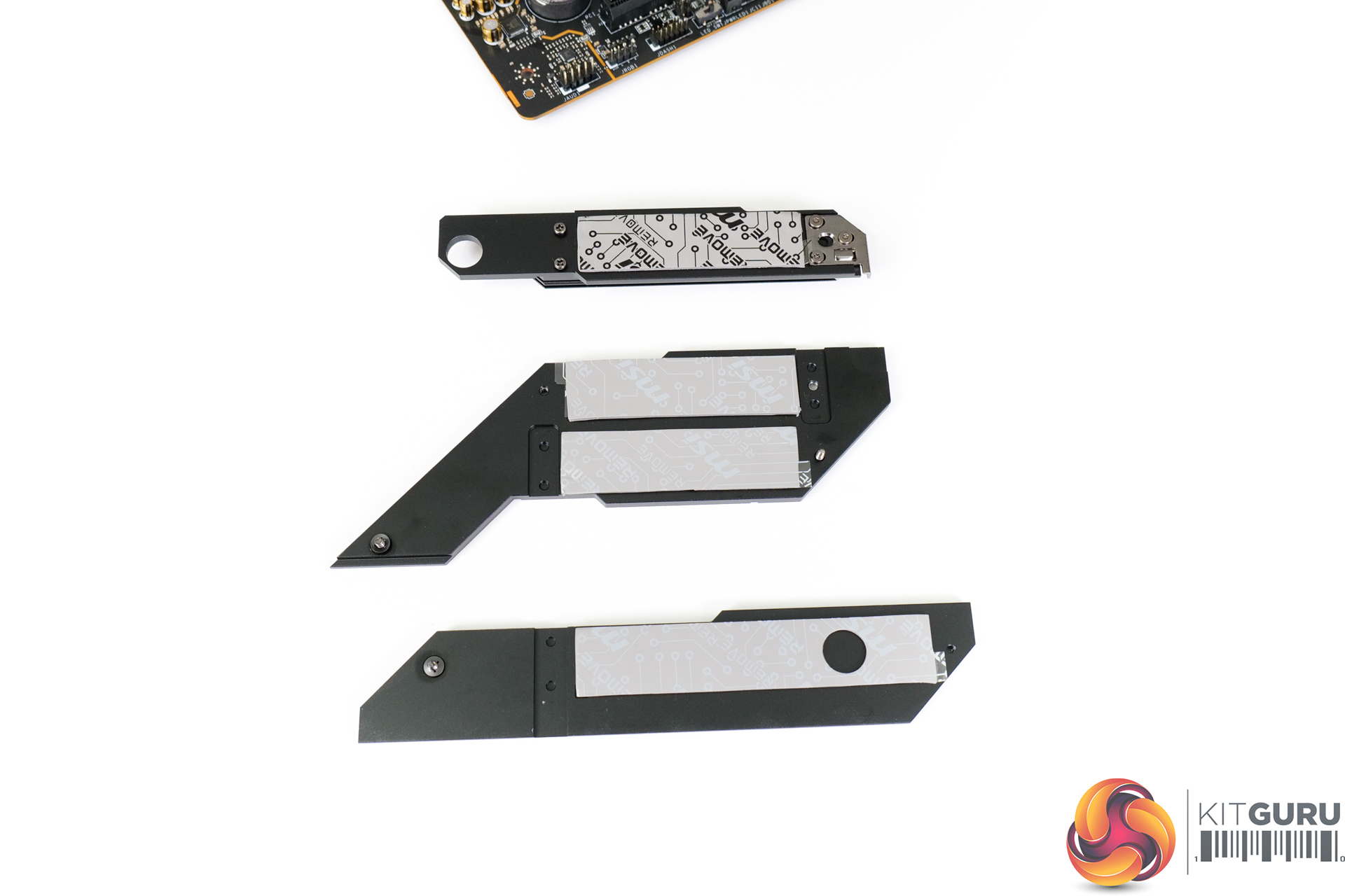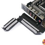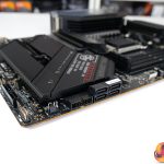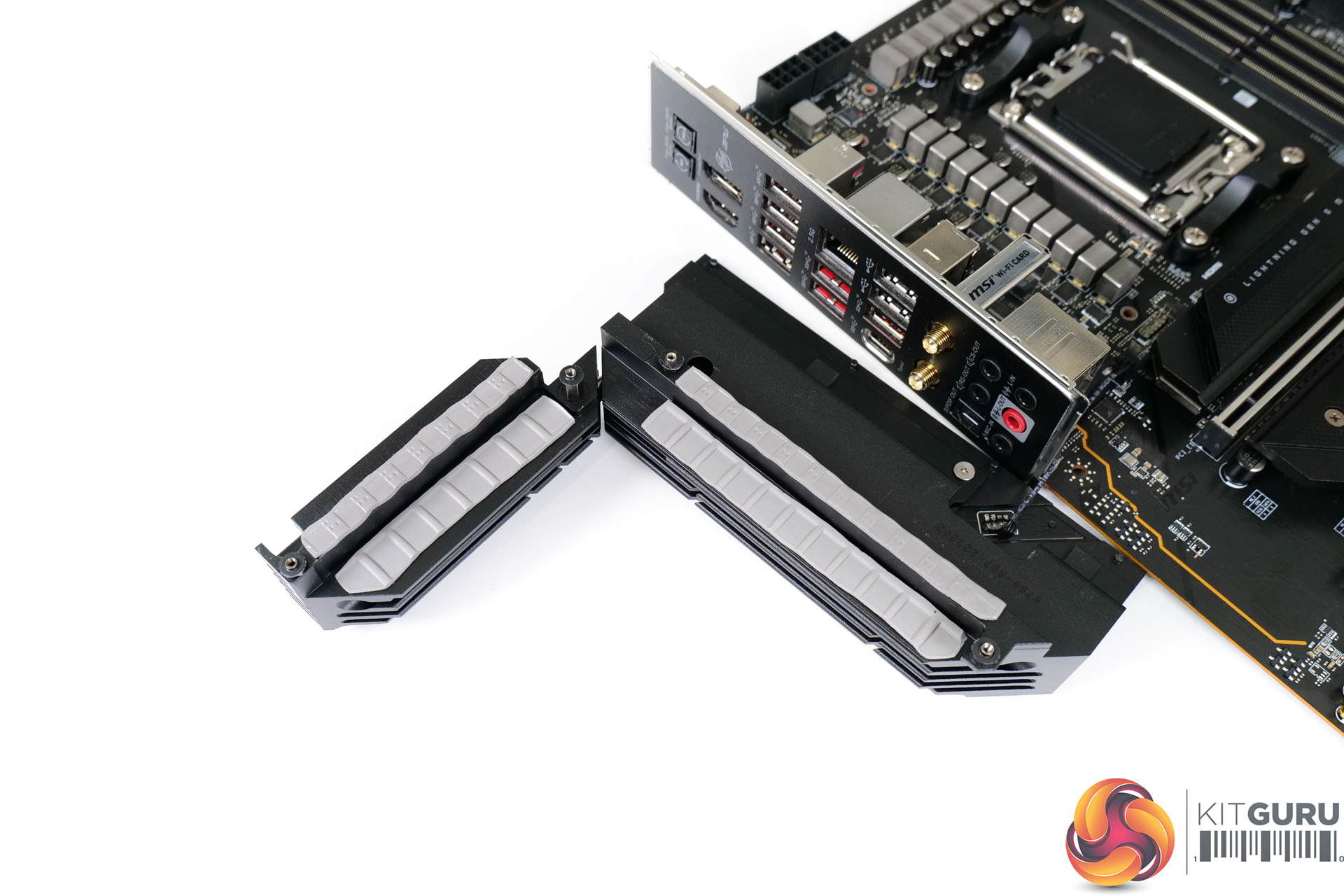 The VRM heatsinks are two large blocks of metal that will aim to cool via their sheer size and heatpipe connection. MSI doesn’t make the best effort to increase surface area via fins but these should be absolutely stellar though, particularly with some airflow nearby. And a sizable rear IO cover sits atop the ports on blends into the VRM heatsink.