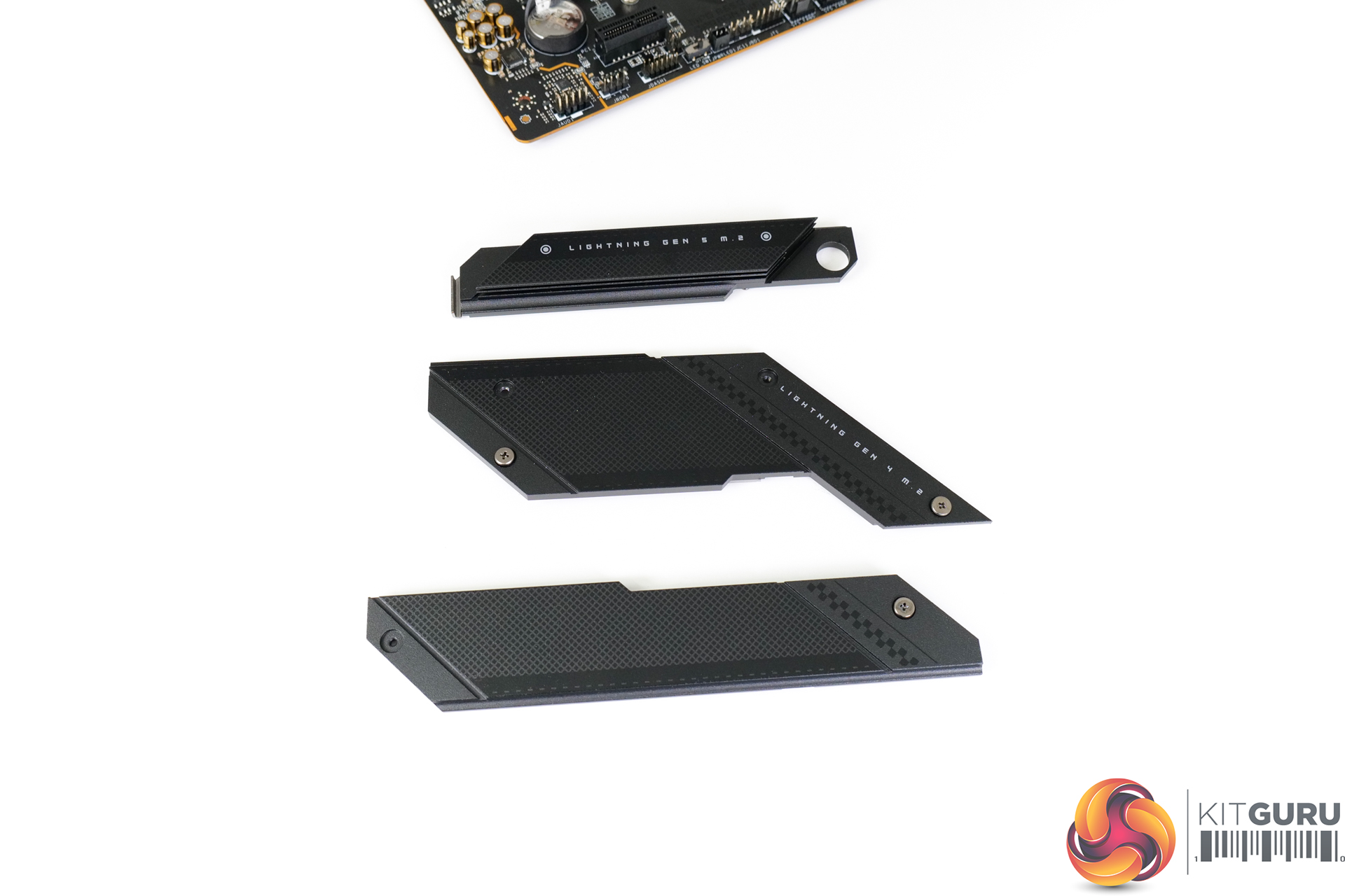 You get an individual strip cooler for the uppermost M.2 SSD slot with thermal pads on both sides. I like this design because it is tool-less through-and-through. As is now common, the SSD can be secured via a tool-less latch. But the heatsink can also be removed by pushing a mechanism to free and pop it out of place.