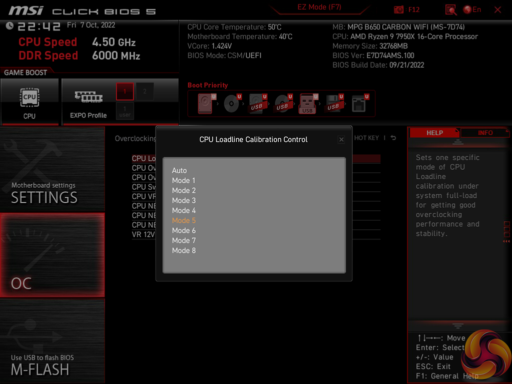 Tweaking the core voltage alongside power and temperature allowances is arguably the best way to overclock these new chips. If you want to do adaptive core ratio overclocking and split it at CCD level, that’s possible. There’s ample opportunity to tune the memory. And voltage control options are strong, though MSI’s loadline calibration settings need an explanation rather than a great, big, unhelpful list.