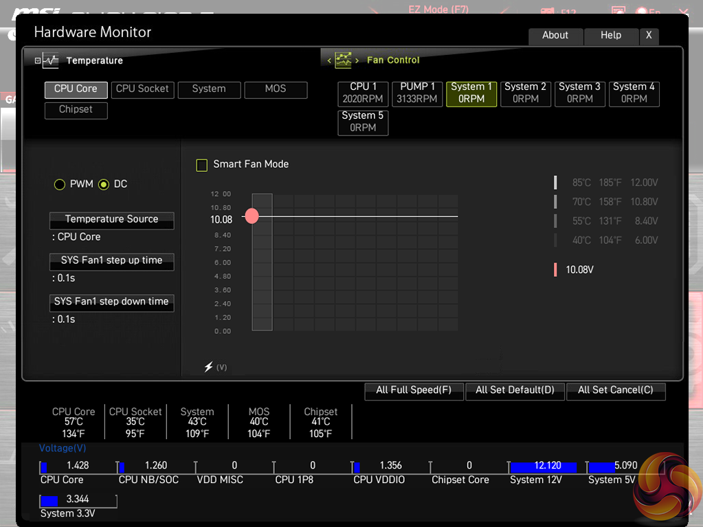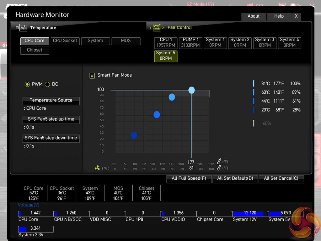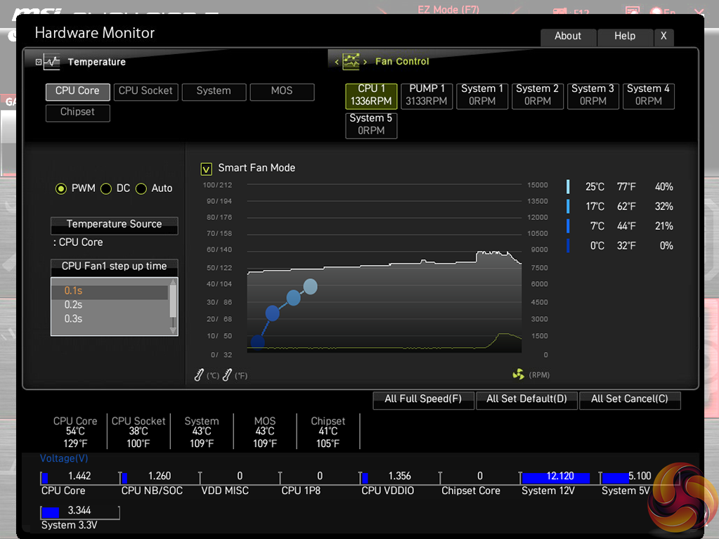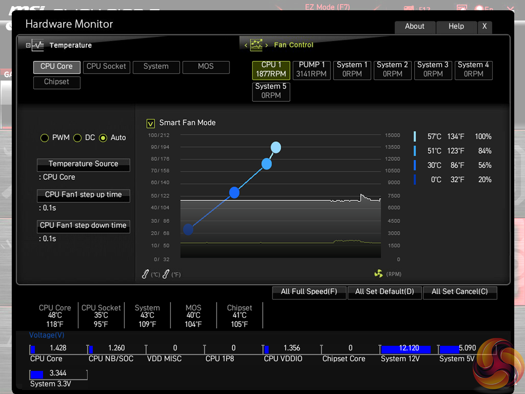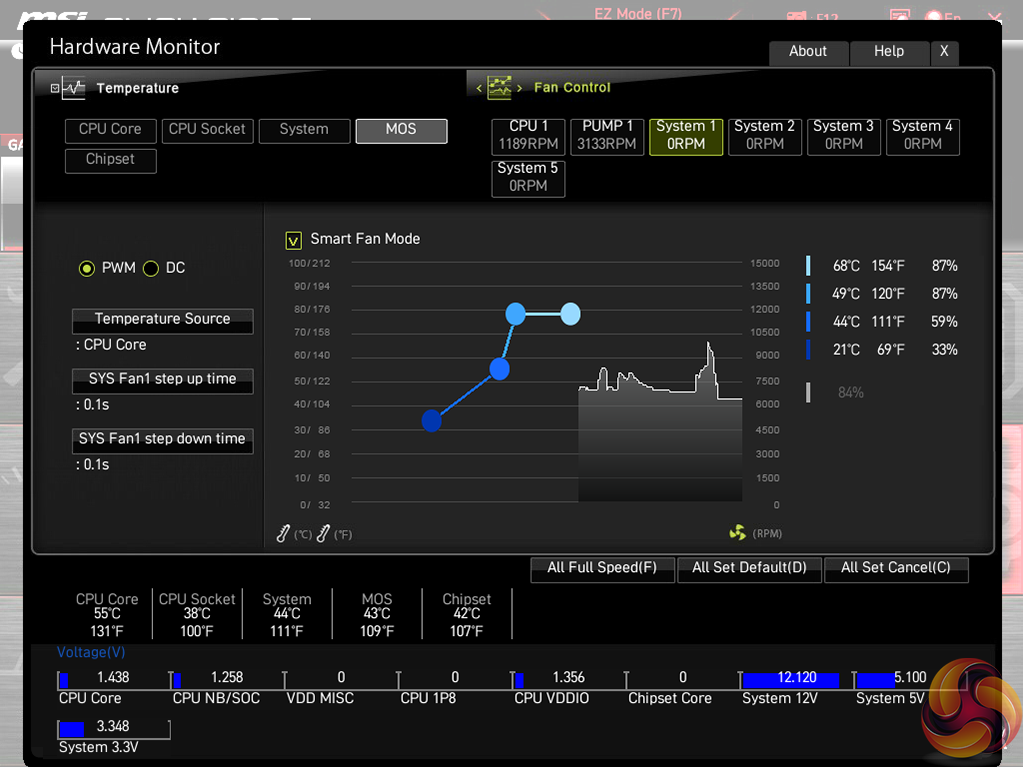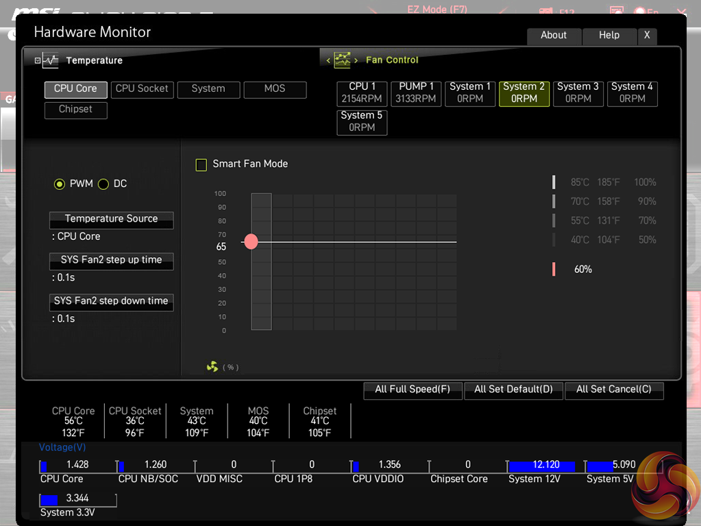 Fan control through MSI Hardware Monitor is strong. Fan control is handled using a 4-point curve system for Smart Control mode or just a single voltage or PWM duty cycle for static – non-smart – speed.