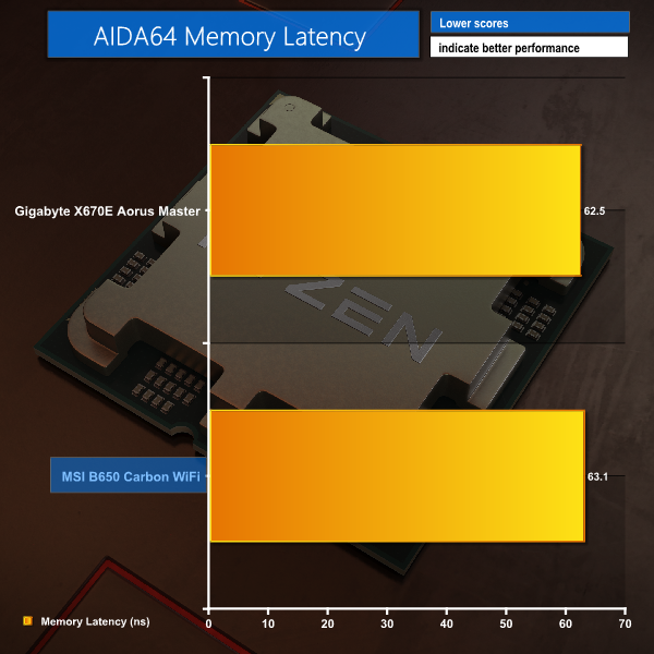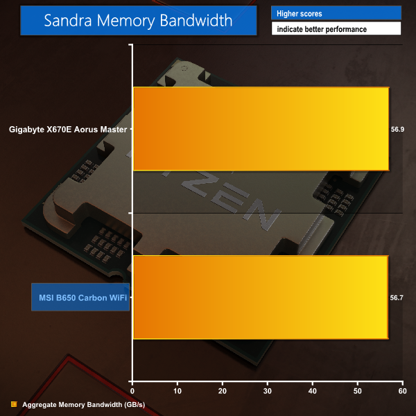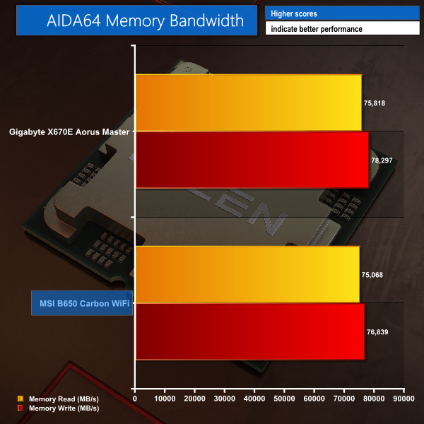 Focusing on memory, MSI’s B650 offering is very slightly behind the AIDA bandwidth of Gigabyte’s more expensive AM5 solution. But there really isn’t much in it for any of the memory tests with our 6000MHz CL30 G.SKILL EXPO DDR5 kit – latency included.