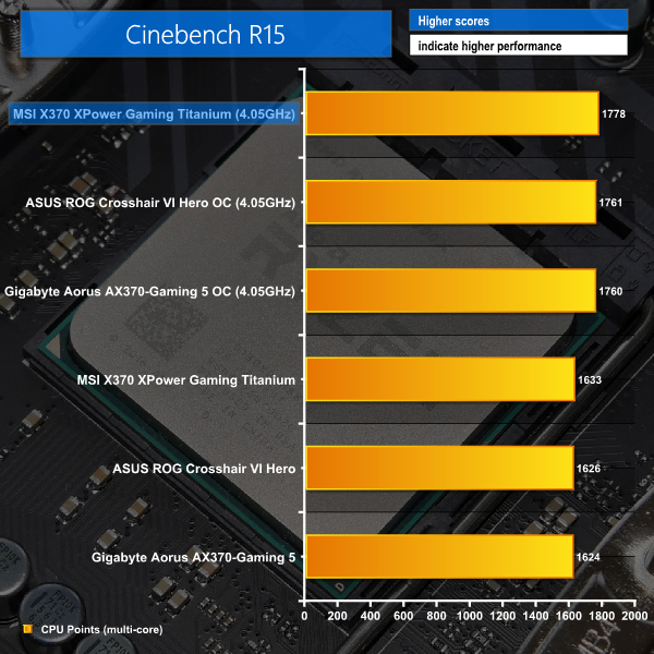 Impressive performance observed throughout stock testing is maintained with the MSI board overclocked. The X370 XPower Gaming Titanium edged out Gigabyte and ASUS competitors in terms of performance, despite operating at the same core and memory speed. Well done to MSI's BIOS team.