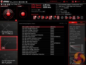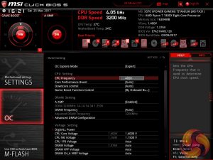 Keying in the overclocked settings is straightforward in MSI's UEFI thanks to its layout. Despite the LLC graph indicating that Mode 3 would give a stable voltage, we found it to overshoot our selected 1.4V level by around 16-24mV under Cinebench loading. Switching to Mode 4 LLC adjusted this and saw the chip operating at 1.40V under Cinebench load.